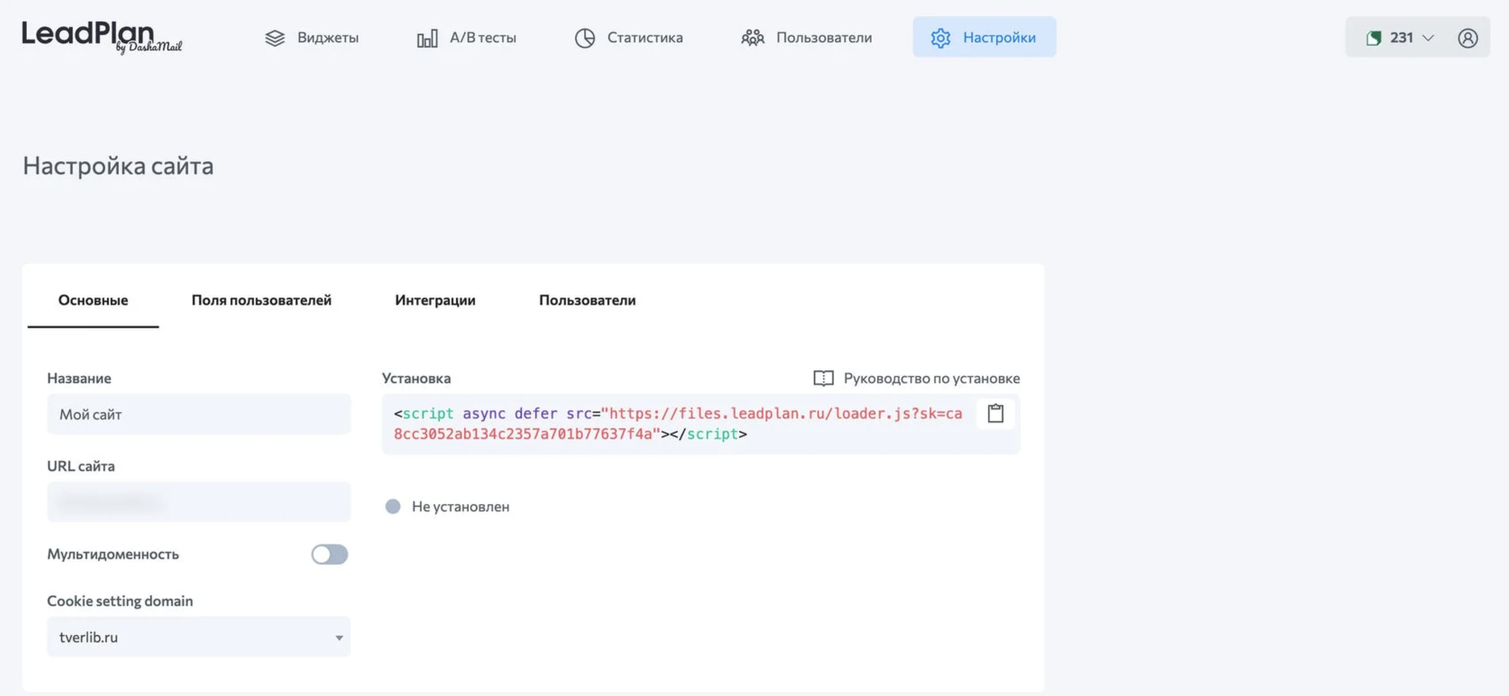 После корректной установки кода, как только LeadPlan начнёт фиксировать загрузки установочного кода, флаг состояния установки изменит своё значение на «Установлен».