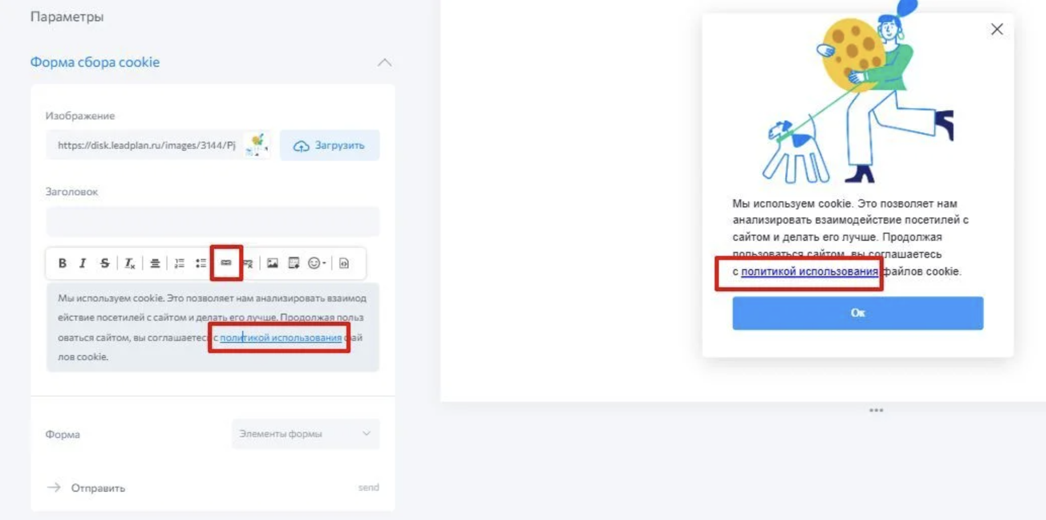 Используйте встроенный редактор текста для добавления ссылки на вашу Политику