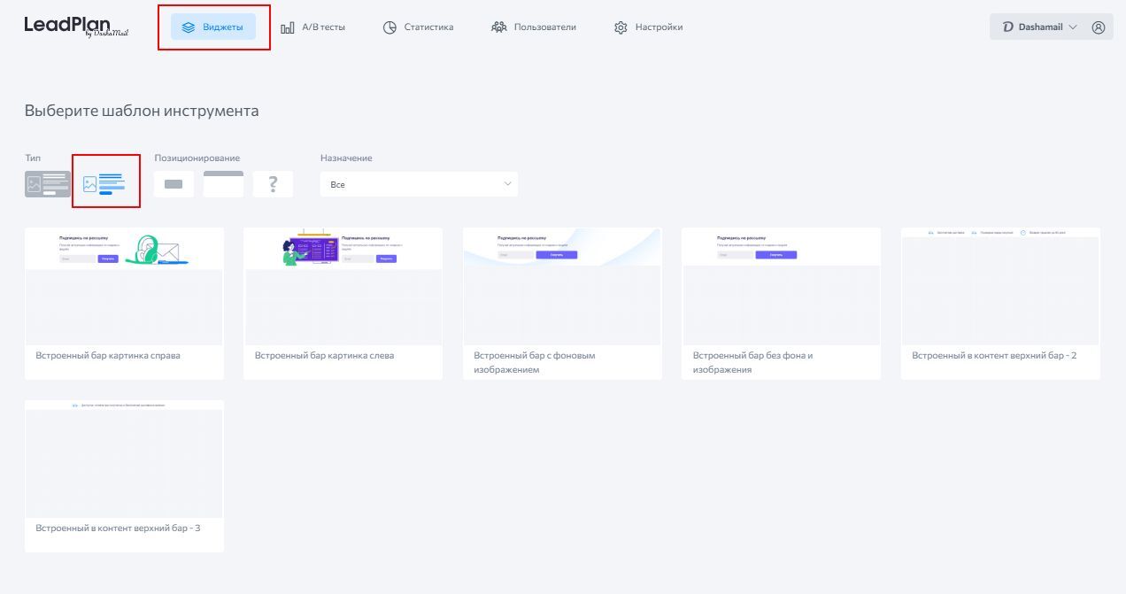Переходим в галерею виджетов и выбираем тип «Встроенные в контент». Выберите подходящий вариант шаблона.