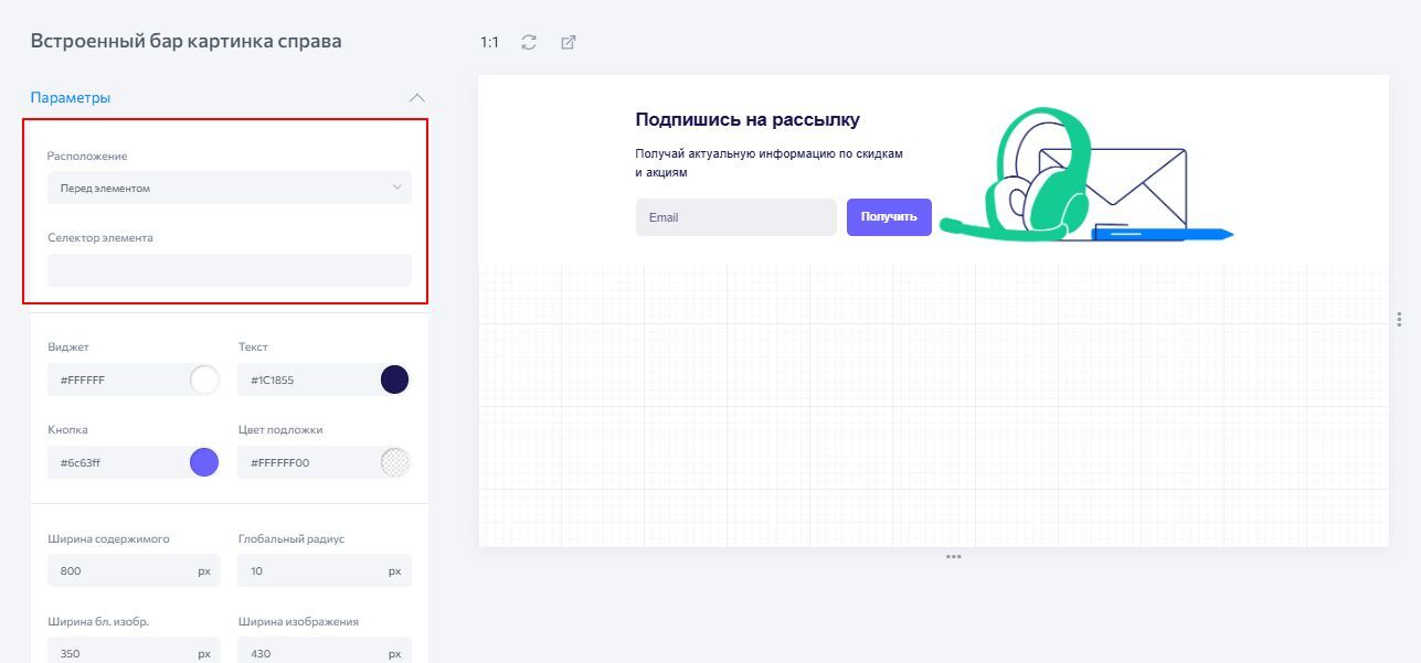 Перейдите к блоку «Параметры», выберите расположение виджета и при необходимости заполните поле селектор, если нужно расположить виджет в определённом селекторе (уникальный CSS-селектор того блока, перед, после или внутри которого вы хотите вставить виджет на странице).