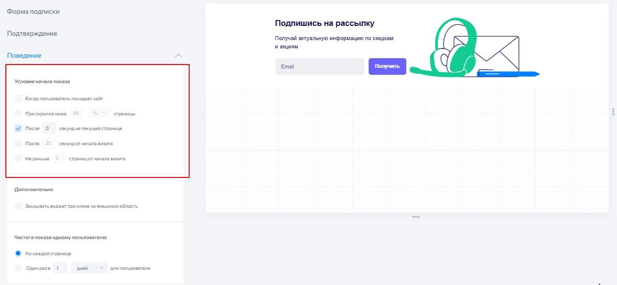 Ниже в этом же блоке установите остальные условия показа по своему усмотрению. Мы рекомендуем настроить показ инлайн-виджета без задержек, потому что это статический элемент: