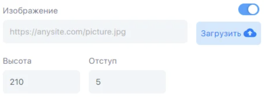 Возможно добавление изображения путём указания прямой ссылки на него в сети Internet. Дополнительно можно указать Высоту изображения (ширина будет выбрана пропорционально указанной высоте) и Отступ до края поп-апа.