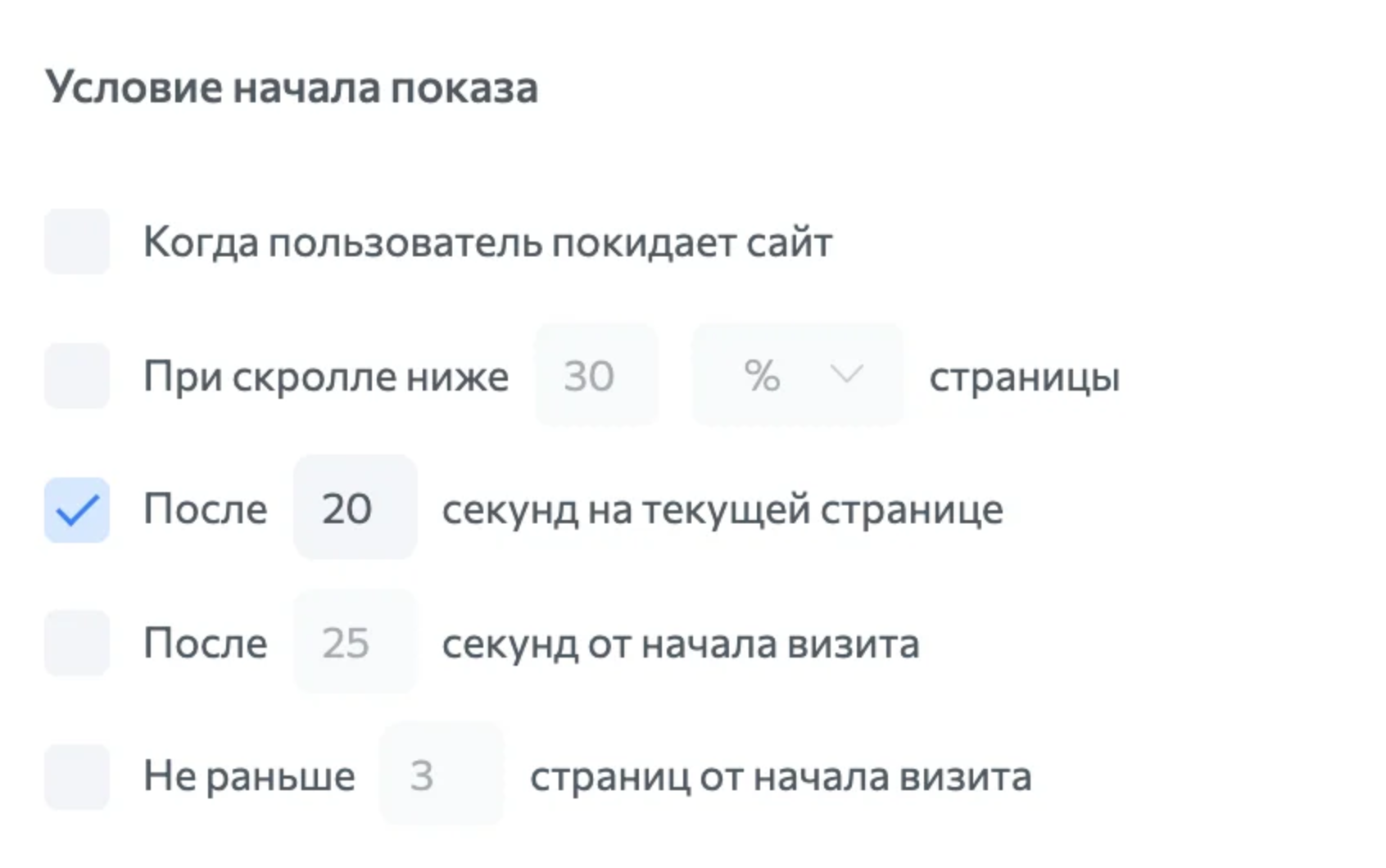 В этом разделе задаётся ряд условий, при выполнении каждого из которых производится немедленный показ (при условии, что пользователь сайта находится в таргетинге и нет других запрещающих показ условий). При каждой загрузке страниц сайта поп-ап по срабатыванию условий может быть показан только однократно.