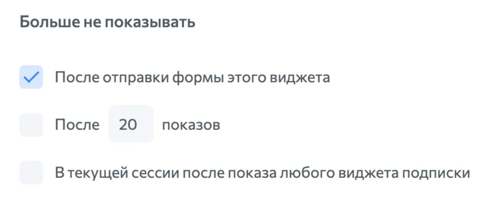 Данные настройки позволяют задать условия, при которых виджет больше не будет показываться в текущей сессии или вообще для каждого конкретного пользователя.