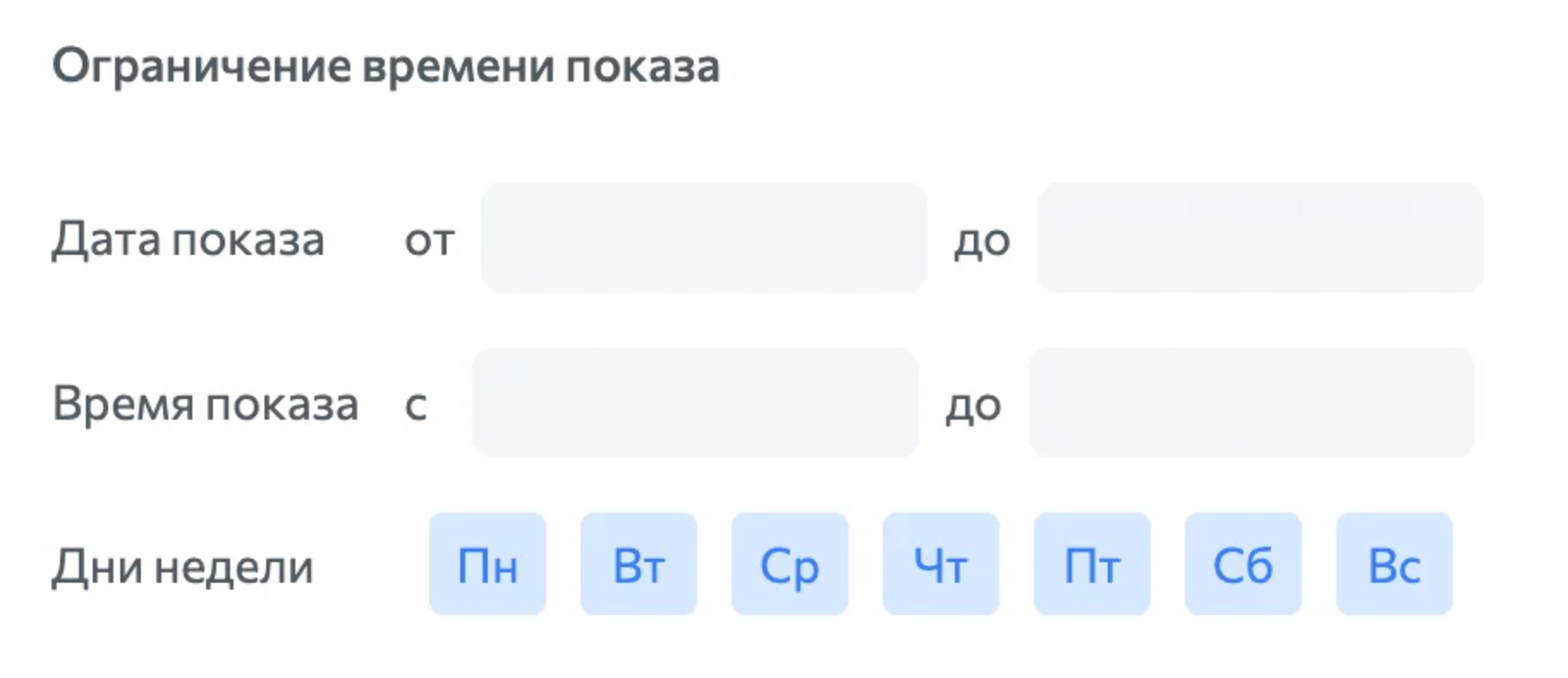 Эти настройки позволяют регулировать временной интервал возможности показа. Чаще всего используется для работы с предложениями сайтов, ограниченными во времени.
