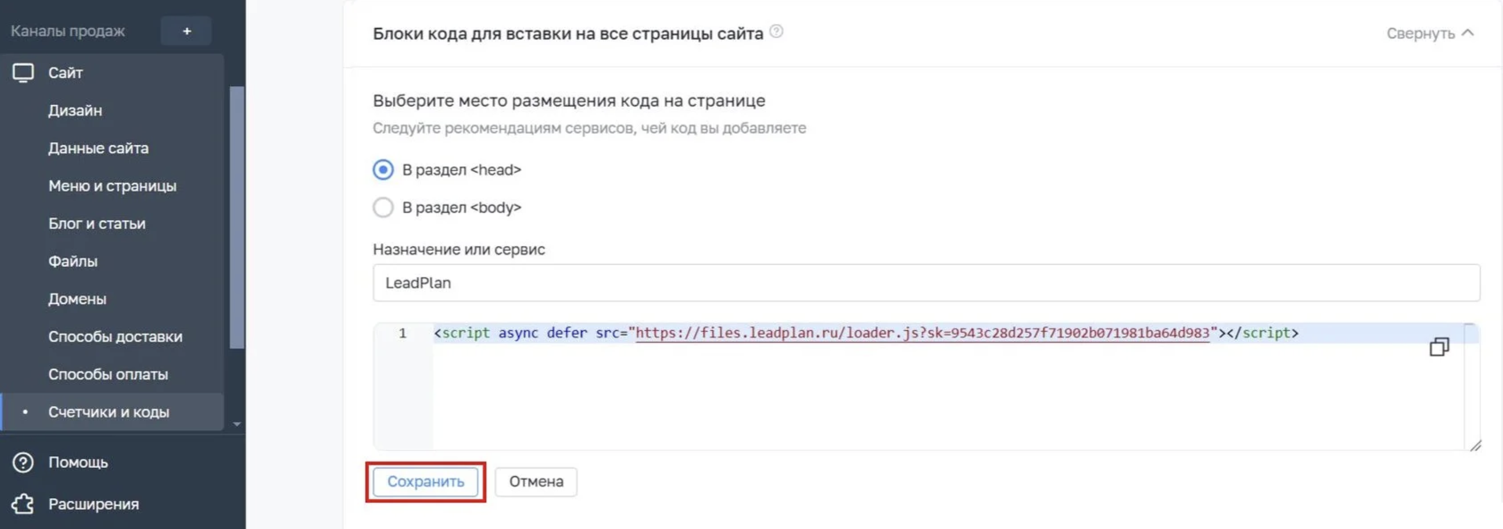 Выберите место размещения кода на странице раздел , укажите назначение или сервис, вставьте код в поле.