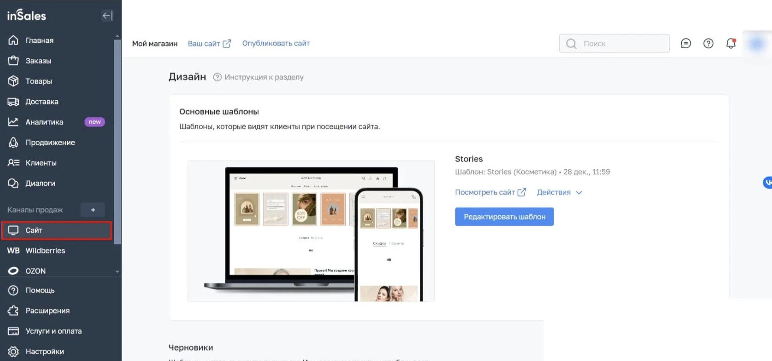 Войдите в ваш аккаунт inSales и выберите "Сайт" в меню слева.