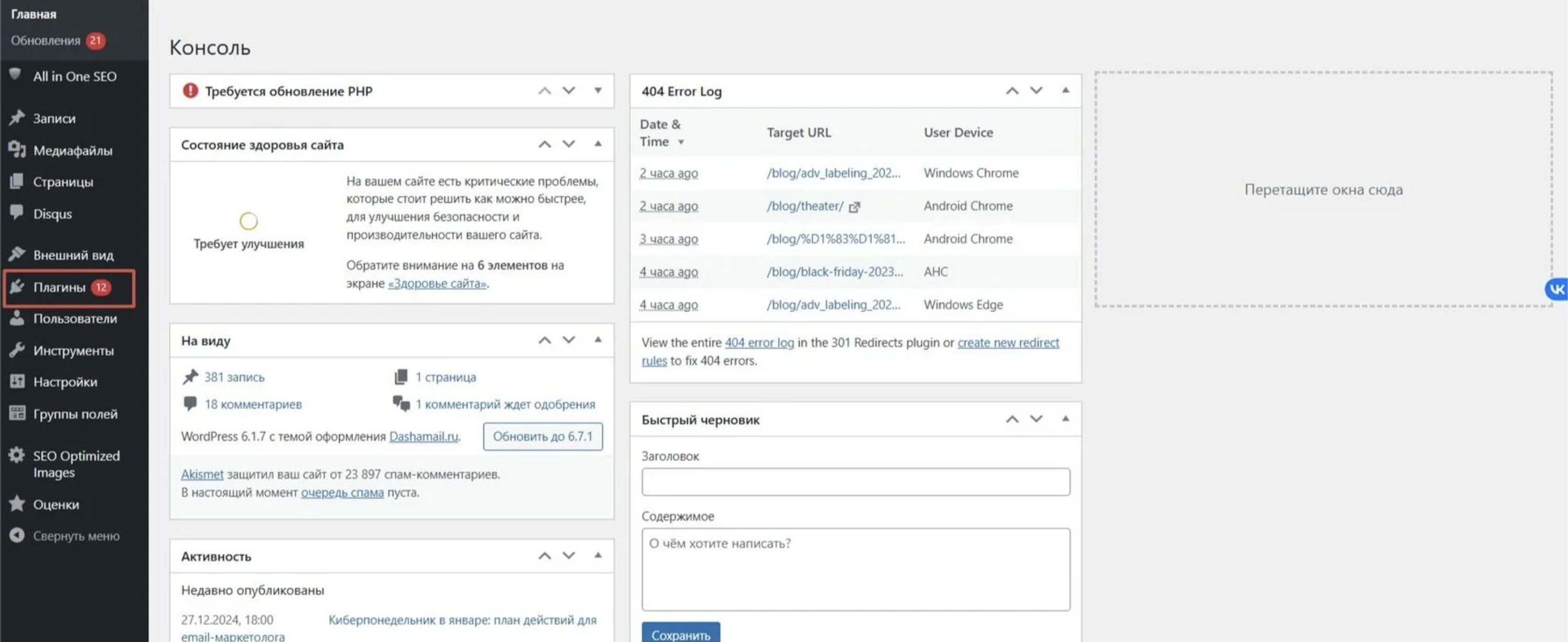 Теперь, в меню WordPress (обычно слева) найдите пункт «HFCM» и нажмите на него.