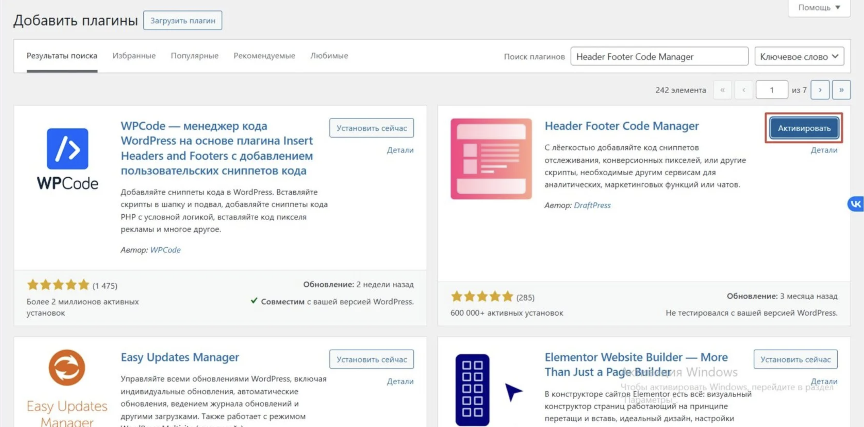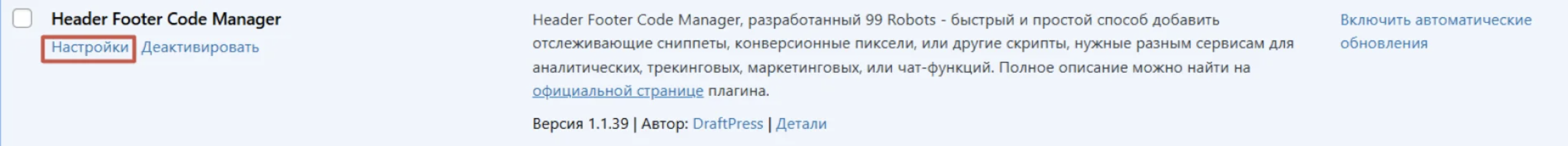 Активируйте и добавьте код в его настройки, для этого перейдите в «Плагины» → Плагин «Header Footer Code Manager"→ Настройки